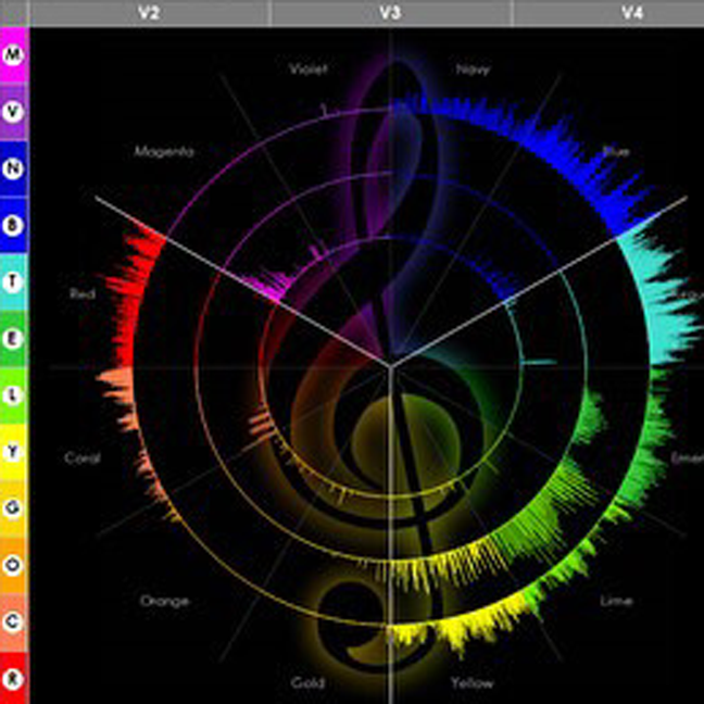 音の周波数を解析して、3つの意識階層に分け、「視感覚」「聴感覚」「体感覚」を色分けし、